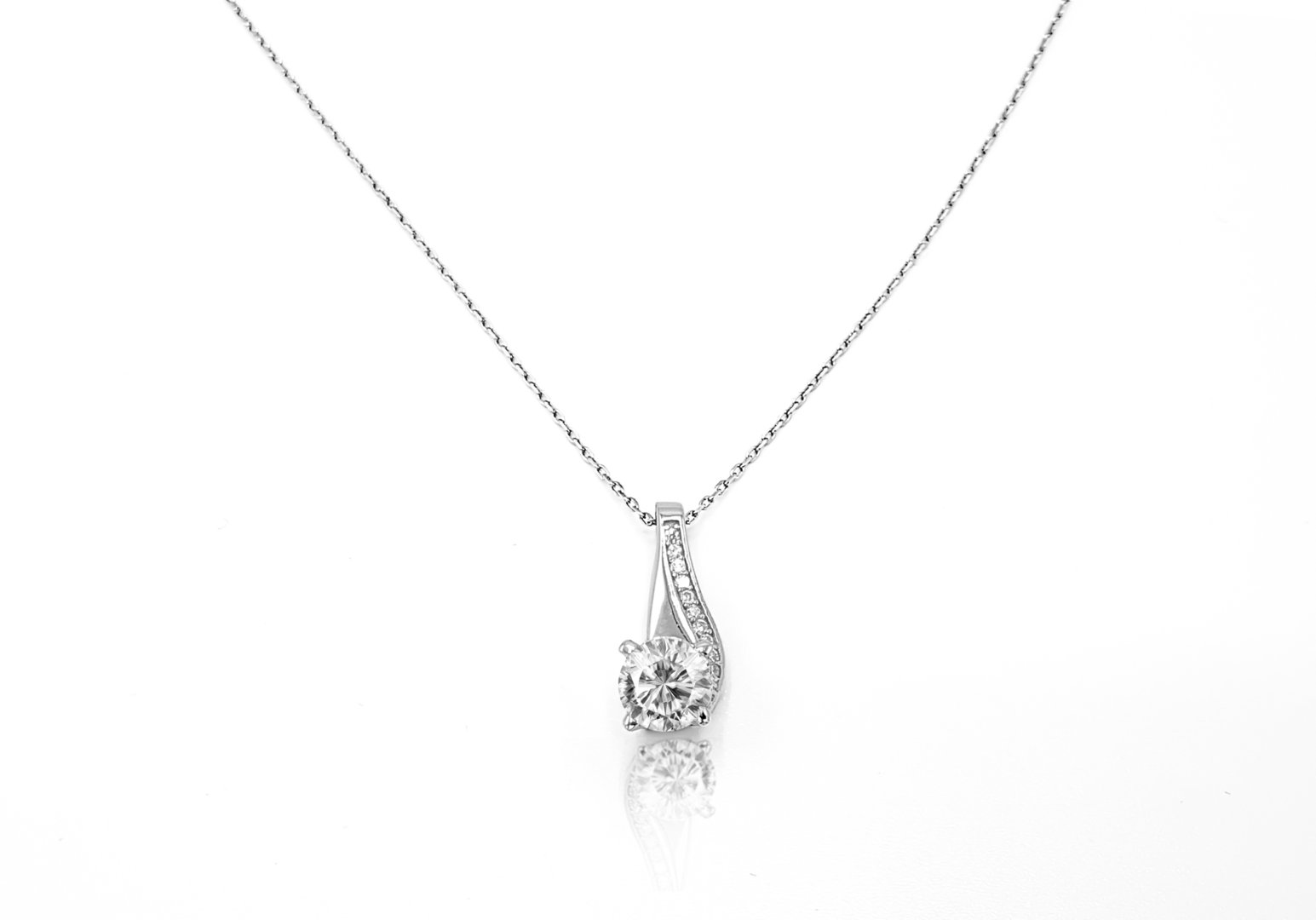 Klein und fein: Der Kettenanhänger besteht aus einem rund eingefassten, weißen Zirkonia-Stein im Brillantschliff und einer ebenfalls mit Zirkonia besetzten zierlichen Anhängeröse.